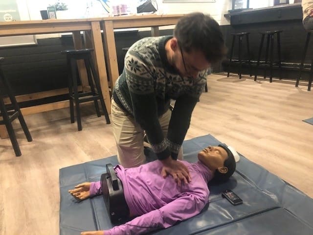 Sinds enkele weken is de AED (apparaat voor reanimatie) verhuisd naar ons pand. Hij hangt nu aan de zijkant van de praktijk bij de parkeerplaatsen. Dit was voor Hidde en Jason een goede reden om deel te nemen aan een cursus reanimatie en het gebruik van de AED. Deze cursus werd gegeven door Hannie van Teeffelen en Rens Parker. In 2 avonden zijn technieken zoals hartmassage, beademing, gebruik van de AED, stabiele zijliging etc., geïnstrueerd en geoefend. Het was een zeer aangename cursus met leuke deelnemers. Maar bovenal was het zeer nuttig. Bedankt Marie-Jose van de Graaf voor het regelen dat wij deel konden nemen!